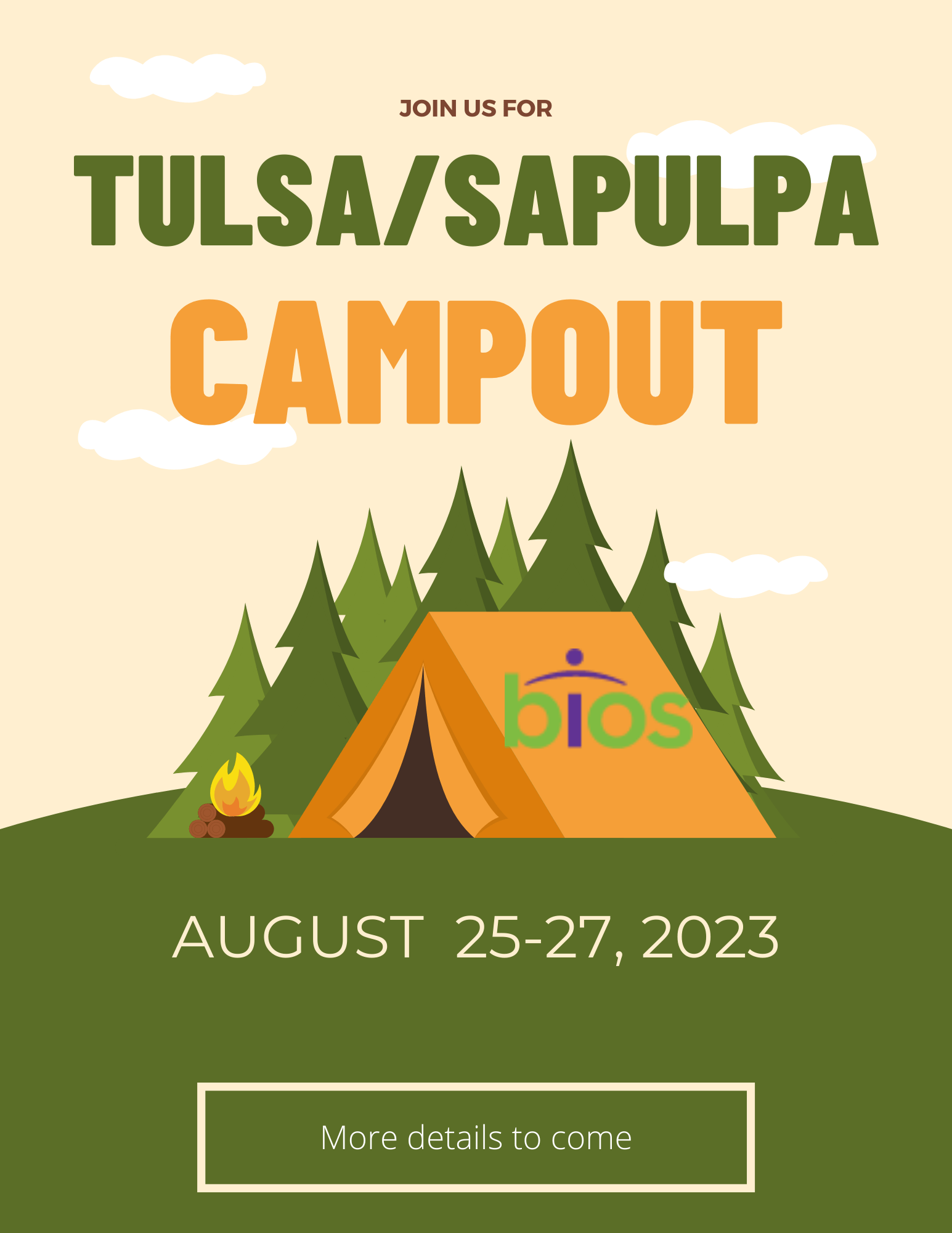 « All Events This event has passed. Sapulpa/Tulsa Campout August 25, 2023 - August 27, 2023 « All offices closed Labor Day-All Bios Offices Closed » More details to come. Add to calendar Google Calendar iCalendar Outlook 365 Outlook Live Details Start: August 25, 2023 End: August 27, 2023